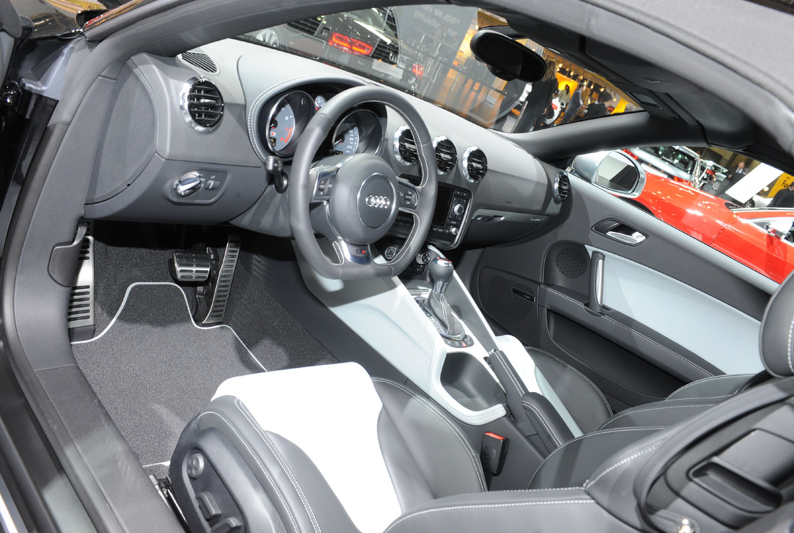 The interior of the TT features a sporty design, dynamic elegance and generous amounts of space. The standard sport seats are mounted low and offer a high level of lateral support. The steering wheel is flattened at the bottom. The five round air vents and the arched cowl over the round-dial instruments exude the spirit characteristic of the TT. The ergonomics are logical and the fit and finish is uncompromisingly precise – just like always with Audi. When the ignition is turned, the dials of the speedometer and tachometer briefly run up to the limit before returning to zero.