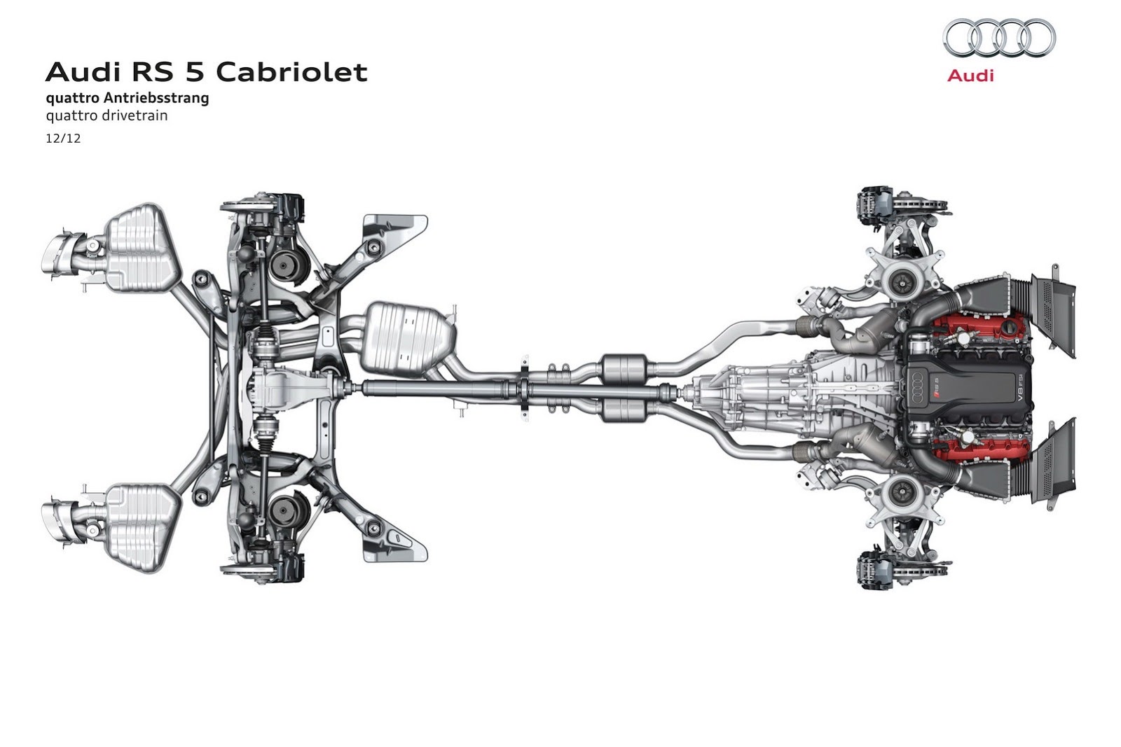 Propulsive power for the RS 5 Cabriolet is supplied by a high-revving, naturally aspirated V8 engine with FSI direct injection. From its 4,163 cc of engine displacement, it outputs 331 kW (450 hp) at 8,250 rpm and produces a maximum torque of 430 Nm (317.15 lb-ft) between 4,000 and 6,000 rpm. The 4.2 FSI with red painted cylinder head covers that is manually assembled in the Hungarian plant in Gy?r achieves a specific power output of 79.5 kW (108.1 hp) per liter engine displacement; each hp only needs to move 4.267 kg (9.41 lb) of vehicle weight. The long-stroke engine with its aluminum crankcase breathes freely; flaps in the exhaust tailpipes vary the sonorous acoustic backdrop. As an option, Audi can deliver a sport exhaust system with black tailpipe trim.