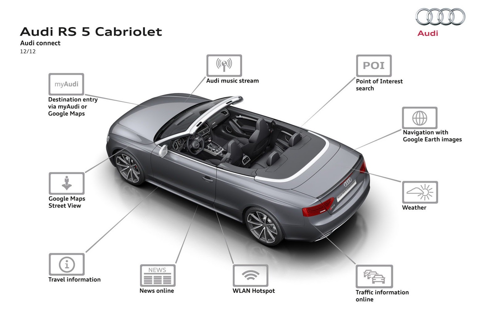 In the multimedia field, Audi is offering a comprehensive modular component system; at the very top there is MMI navigation plus which includes a large hard drive, DVD drive and seven-inch color monitor. An ideal complement is Audi connect with car phone, which connects the RS 5 Cabriolet to the Internet. Audi connect lets passengers freely surf the web with their mobile end devices via an integrated WLAN hotspot. Customized online services from Audi connect are also available to the driver - they range from Audi traffic information online to navigation with Google Earth images and Street View.