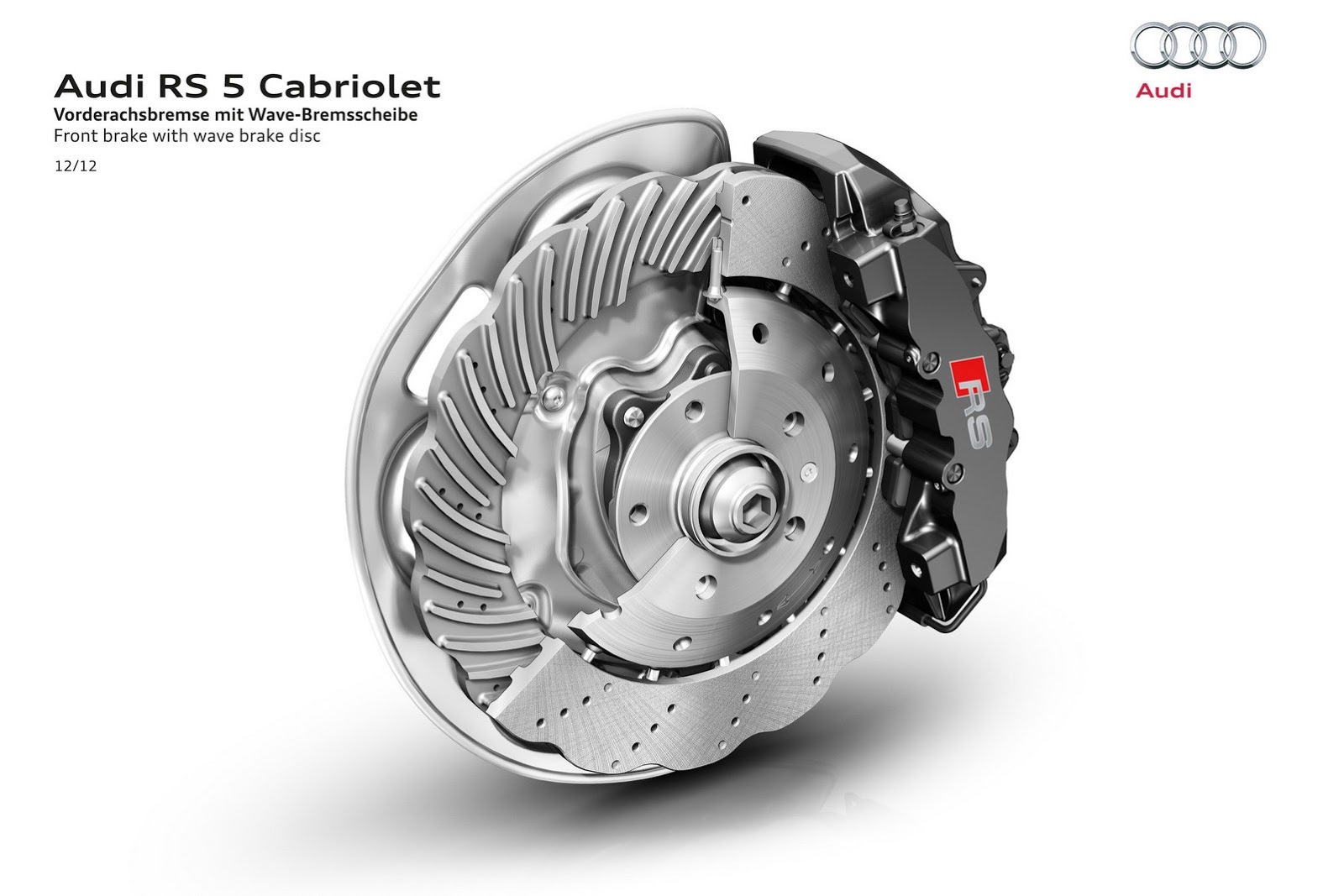The brake system of the RS Coupé features large, internally ventilated wave brake discs, with the front discs measuring 365 millimeters (14.37 in) in diameter. The steel friction rings with their wave-like outer contour are perforated and connected to the aluminum brake caps via pins. This direct structure reduces tensions, quickly dissipates the heat and prevents the transmission of temperature peaks. Moreover, the redesigned shape of the friction rings results in three kilograms (6.61 lb) of weight being saved in total, thus improving the balance of unsprung masses.