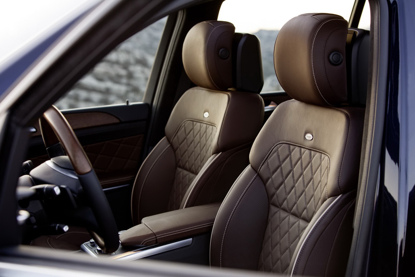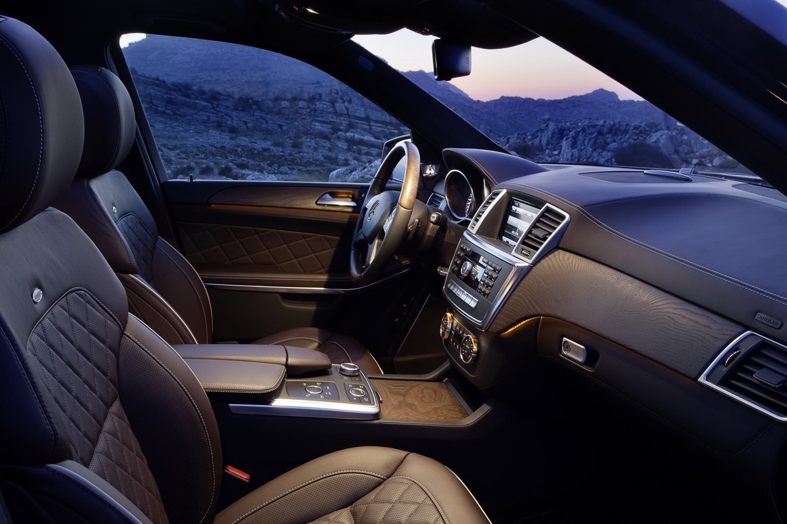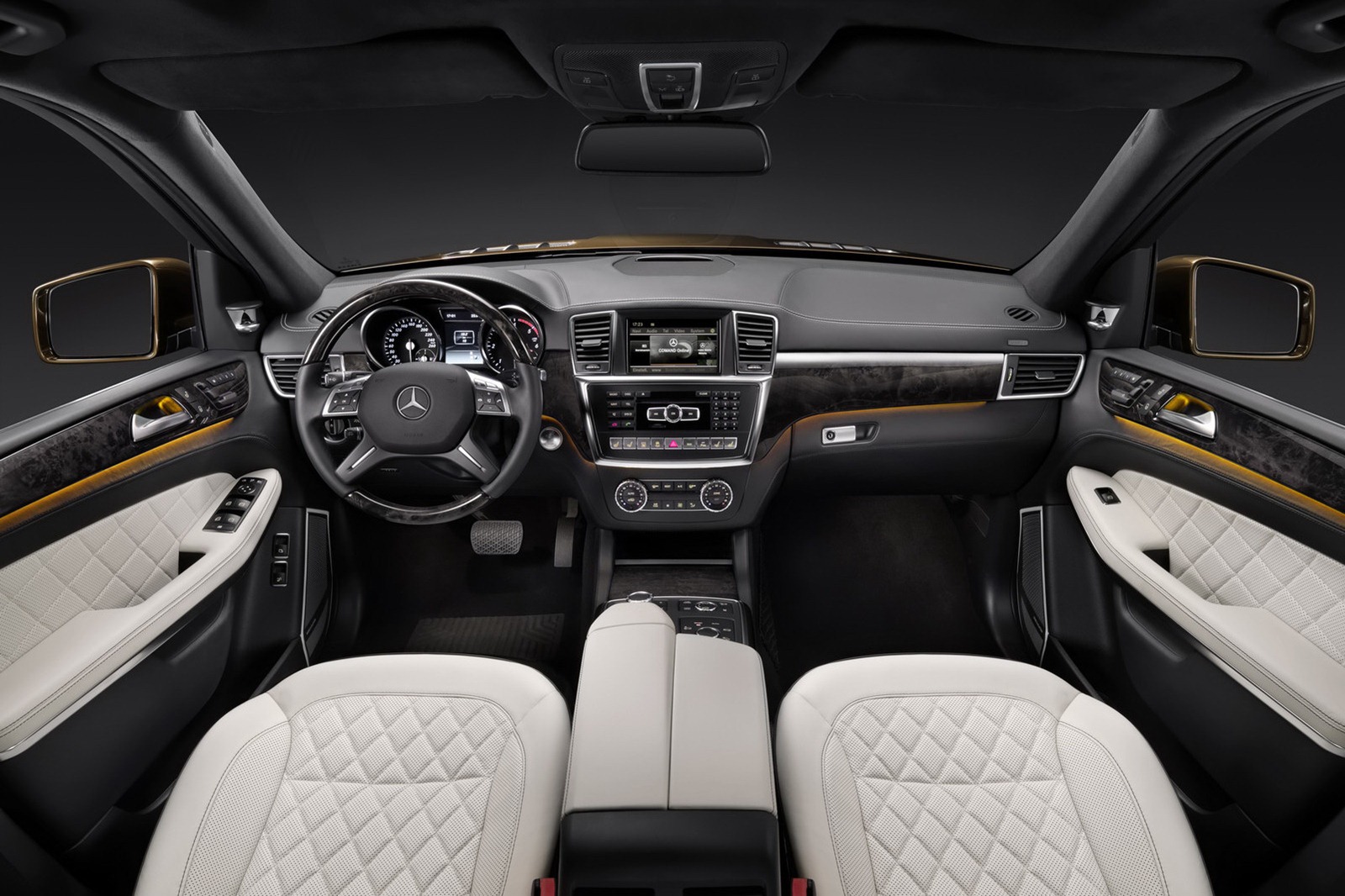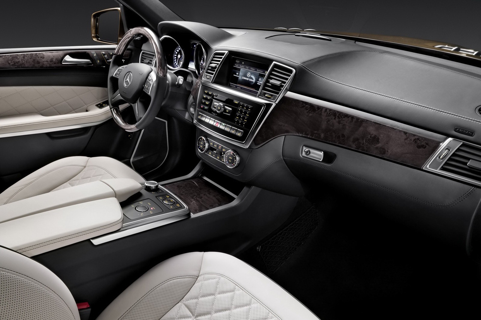 Situated on the centre console, beneath the centre armrest with its integral palm support there is a generous stowage compartment, in front of it the Controllers and switches for the off-road programs, for example, the AIRMATIC air suspension and the COMAND system. Integrated here are two cup holders which can be heated and cooled as an option and which can be covered with a high-quality retractable wooden cover. In the door lining with distinctive stitching the trim from the dashboard continues, whilst the door openers and seat adjustment switches are arranged in the proven Mercedes fashion. The designo Exclusive package is available as an optional extra, and amongst its features are fine designo nappa leather, extensive stitching and a exclusive diamond quilting on the seats and door lining.