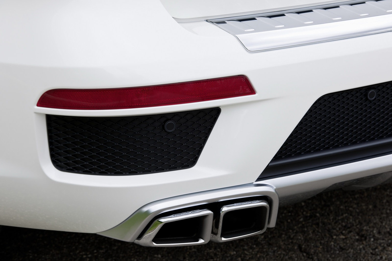 The AMG front apron elegantly merges into the exclusive wheel-arch flaring. In order to accommodate the large 53.3 cm (21-inch) AMG light-alloy wheels with the wide-base 295 tyres, the flaring widens the vehicle by 22 millimetres on each side. From the side, observers will notice the V8 BITURBO logos on the wings and illuminated running boards with an aluminium finish. The rear wheel-arch flaring blends into the AMG rear apron which is again adorned with a striking trim insert in matt silver chrome and the suggestion of black air openings. Creating both a visual and acoustic highlight are the two chrome-plated, exposed twin tailpipes of the AMG sports exhaust system.