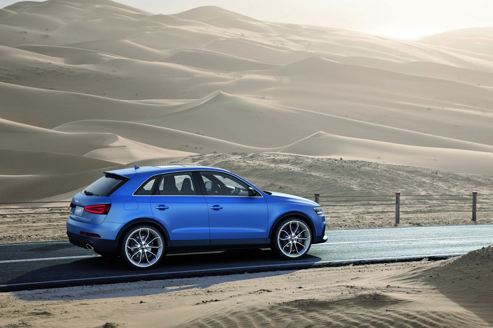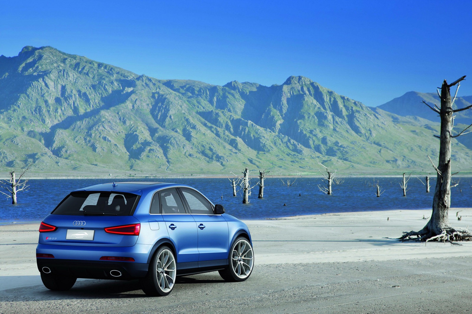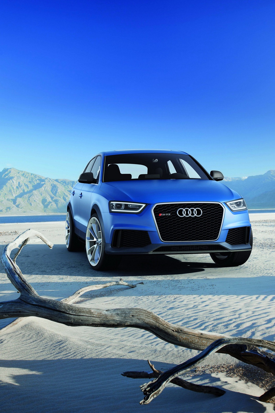 The blue painted Audi RS Q3 concept is a vehicle based on the theme of thrilling dynamic performance. Its engine, a 2.5 TFSI with 265 kW (360 hp) of power, and its body – lowered about 25 mm (0.98 inches) and widened with sharp visual details – explore the potential of the Q3 model series in a new way.