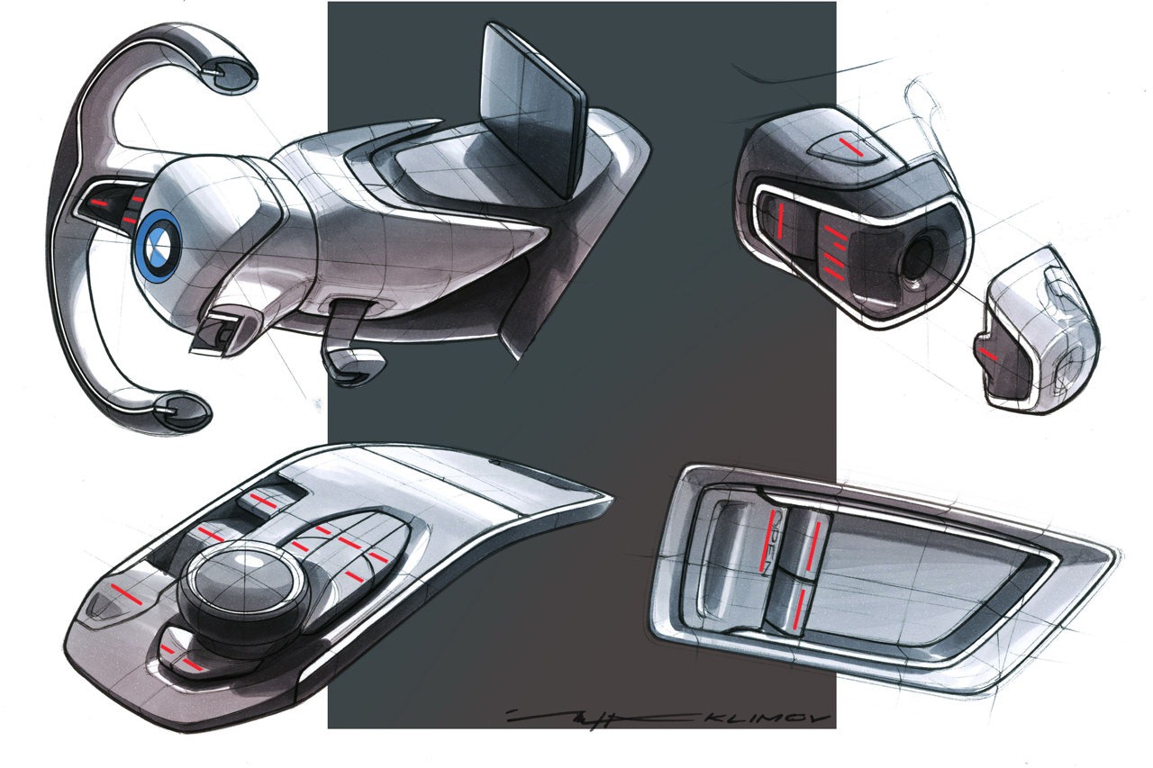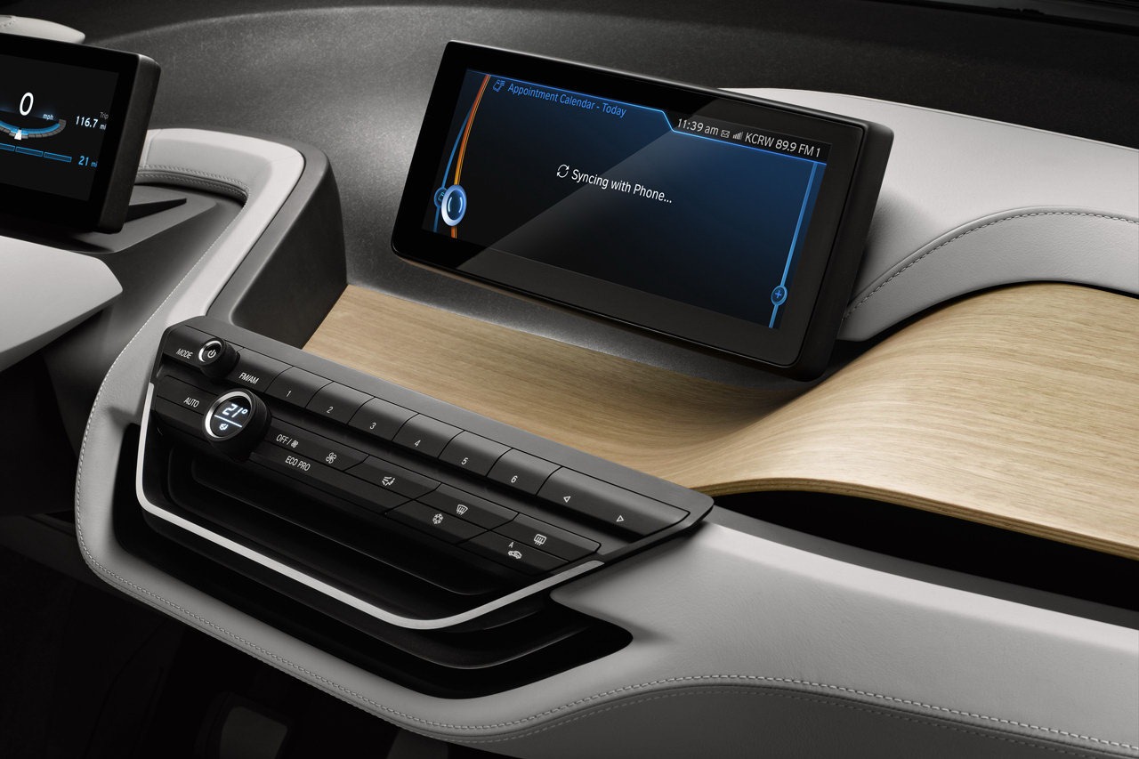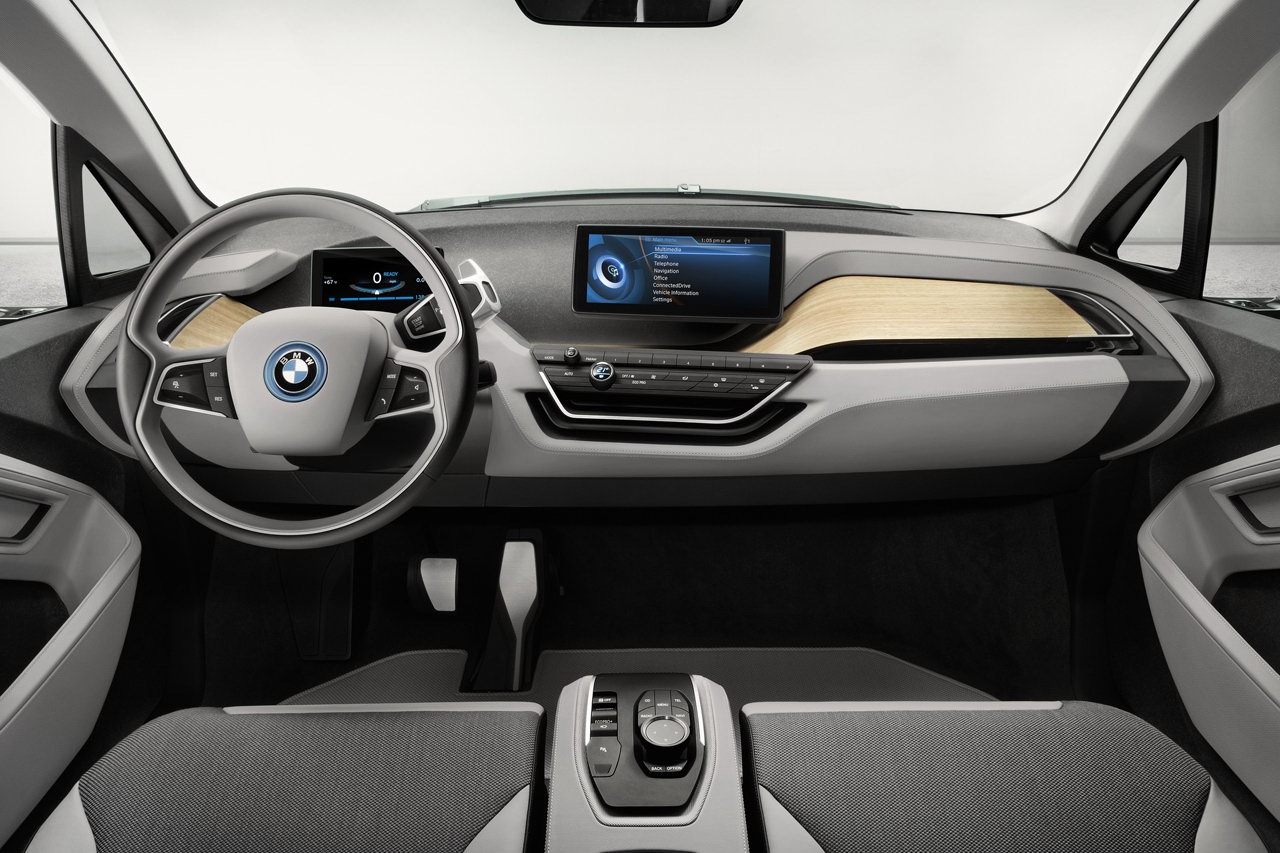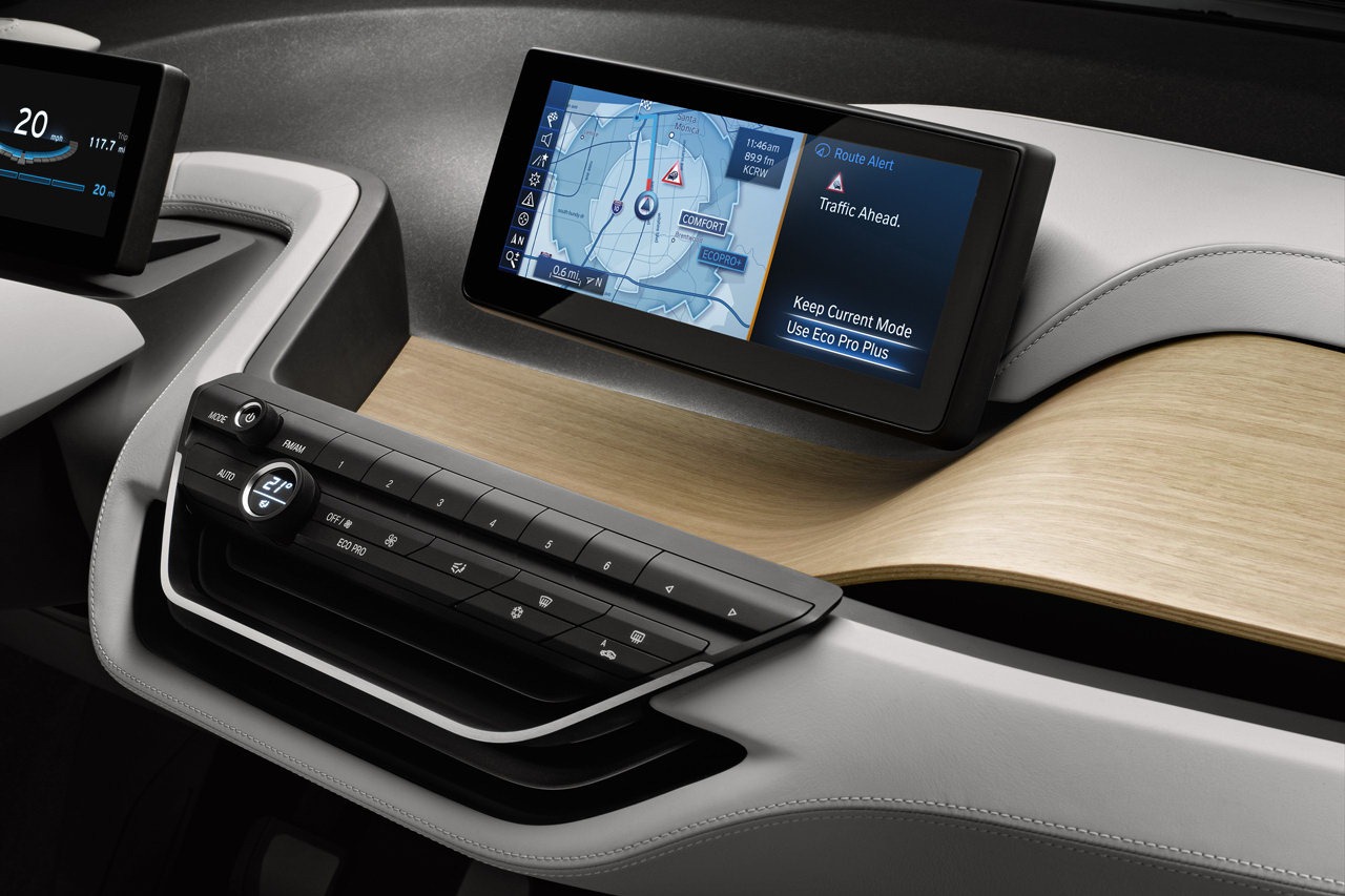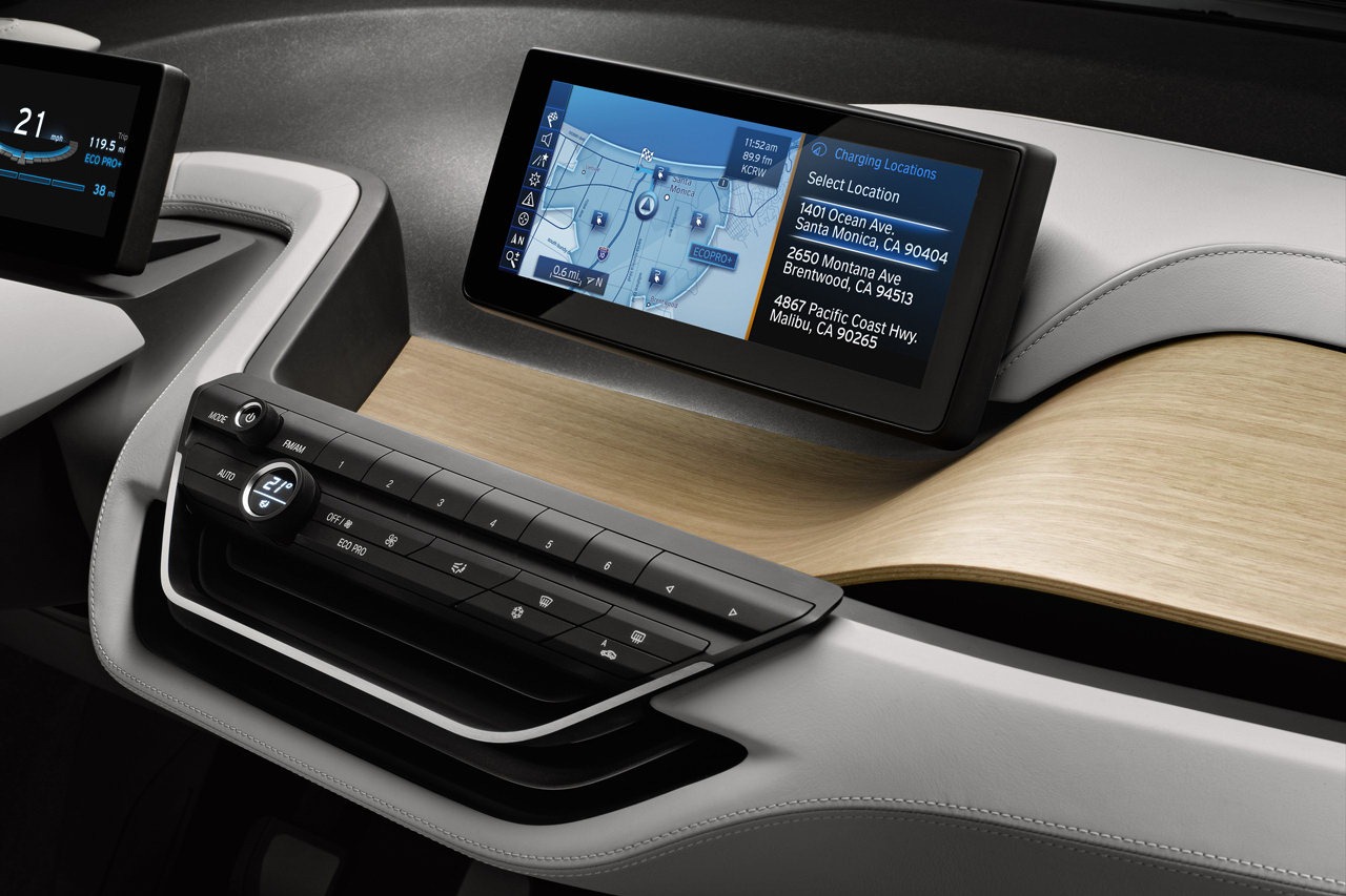 Information is visualised in the form of three-dimensional, high-resolution graphics depicted in the reduced style typical of the BMW i brand. The task of the instrument cluster is assumed by a 6.5 inch (16.5 centimetre) screen positioned on the steering column, where all driving-related information appears in digital form. The second display in the centre of the dashboard is positioned at exactly the same height for perfect legibility. With a screen diagonal of 8.8 inches (22.4 centimetres), it enables detailed graphics to be reproduced, just like the central information display in BMW production cars. This screen is used, for instance, to display the functions of the navigation system including the BMW i ConnectedDrive services. The information provided by the functions familiar from BMW ConnectedDrive is likewise shown here. This central information display also serves to keep the driver and front passenger fully informed of the vehicle's status and the drive system's operating mode.