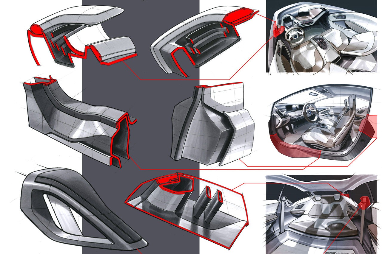 Transferring the design idiom developed specifically for BMW i cars to a coupe concept has resulted in a body whose styling smacks of fun at the wheel while still plainly signalling sustainable mobility. The BMW i3 Concept Coupe's looks let the brand values of efficiency, lightness, safety and premium quality clearly shine through, along with the study's distinctly dynamic bias. The exterior surfaces and colour scheme are structured in such a way as to visualise the basic construction defined by the LifeDrive architecture. The principle of overlapping levels known as "layering" serves to symbolise the harmonious interaction between the striking construction and design elements of the Life and Drive modules, as well as providing the basis for a transparency in the vehicle design that reinforces the concept's sustainability. For instance, the structure of the carbon-fibre material employed in the Life module can be clearly seen in the entrance area and the roof pillars when the door is opened. It is here, as the two-dimensional CFRP laminate typically used for load-bearing elements comes into view, that the material's composition becomes particularly apparent.