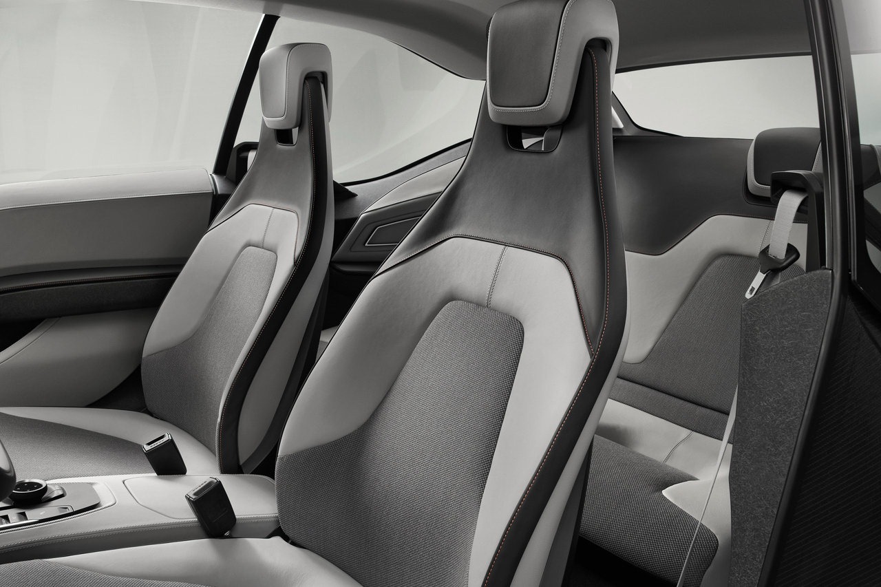 The manually adjustable seats with integrated head restraints that were specially designed for the BMW i3 Concept Coupe are upholstered in a blend of warm-toned textured wool yarn and a cool-looking monofilament material. The elegant, sporty colour scheme's light grey tones also reflect the sustainable character of the natural materials. The door support panels made from anthracite-coloured kenaf fibre are perfectly in keeping with this, and also blend harmoniously with the doors' leather trim panels. The leather adorning the interior of the BMW i3 Concept Coupe is treated using natural products exclusively, with an extract from the leaves of the olive tree serving as the tanning agent.