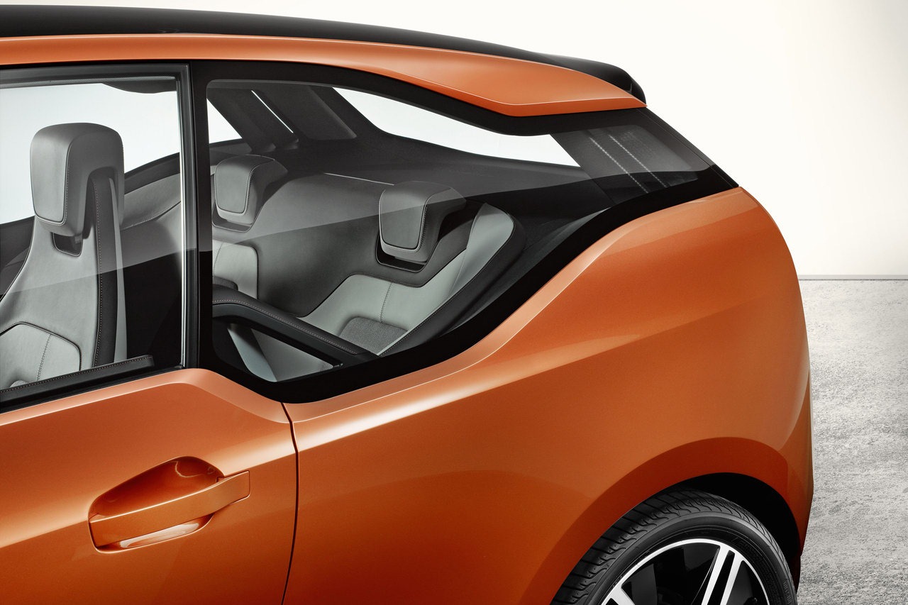 The bodywork panels around the wheel arches, doors and rear sidewalls are painted in Solar Orange metallic, a warm shade bursting with energy that was created especially for the BMW i3 Concept Coupe. It forms an electrifying contrast with the high-gloss black finish on the bonnet, roof and boot lid, as well as with the body's black lower edge.