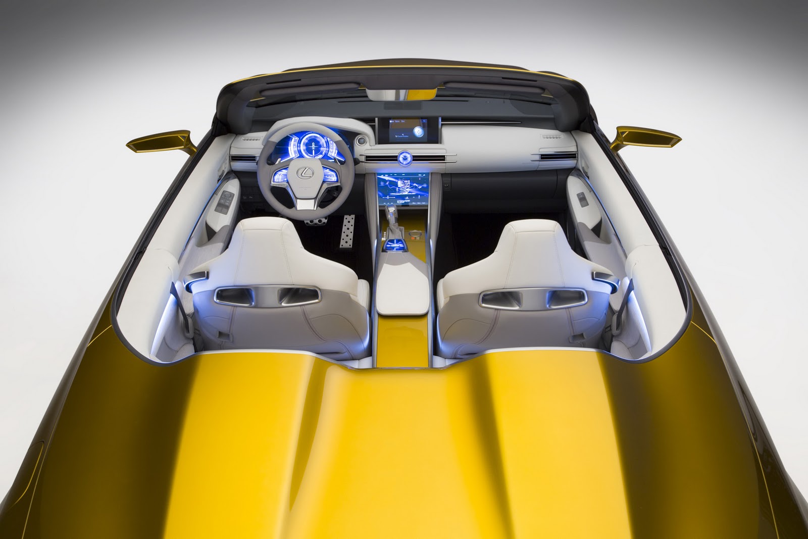 The exterior styling of the LF-C2 was influenced by the way various surface shapes interact with different types of light. Designers created edges, planes and curvature that would allow the LF-C2 to exude a different character when seen from different angles and under different lighting conditions. This objective when combined with Lexus’ layered paint process results in a striking and progressive interpretation of an open top luxury GT.
