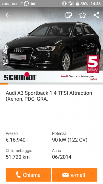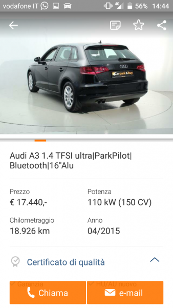 un'Audi A3 Sportback S-Line 1.4 122cv cambio manuale, sempre optional di interesse, a 16.000 (60.000 km dell'08/2013)