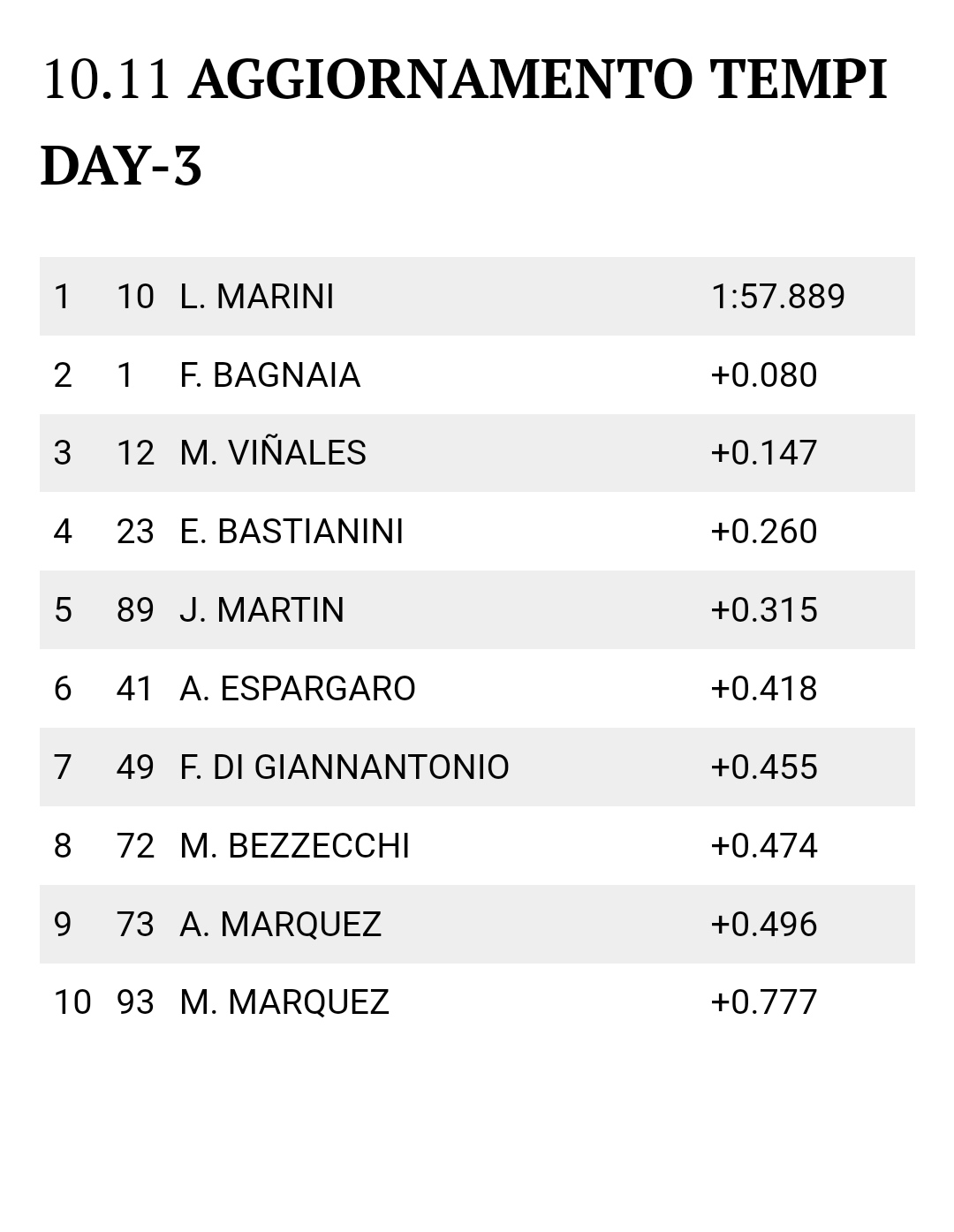 10 21 Franco MORBIDELLI ITA Monster Energy Yamaha MotoGP YAMAHA 1’59.118 54 59 0.648 0.082 333.3