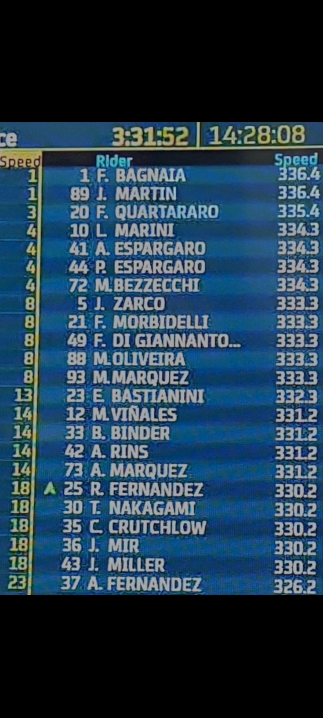 3 23 Enea BASTIANINI ITA Ducati Lenovo Team DUCATI 1’58.732 42 54 0.262 0.132 336.4
