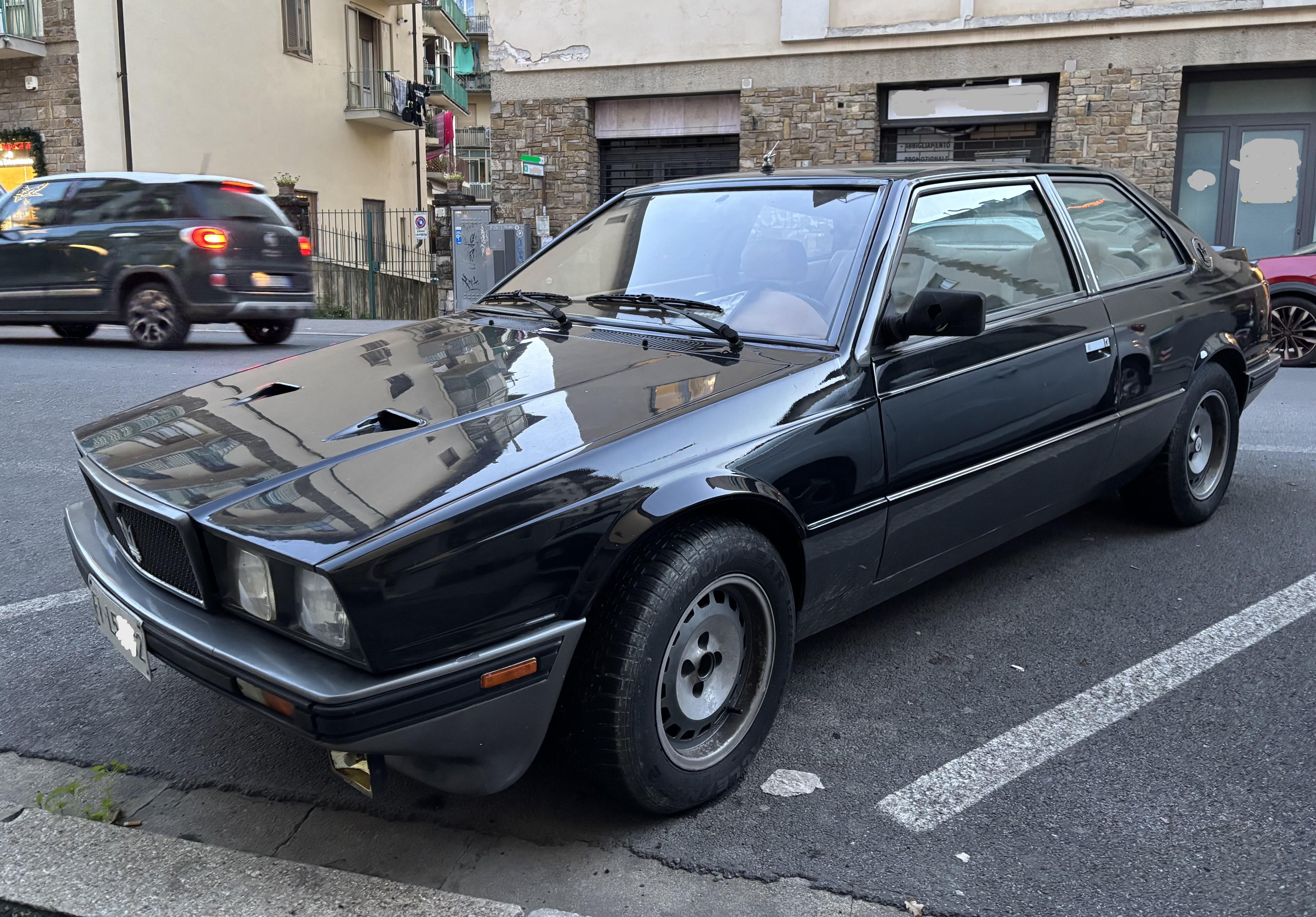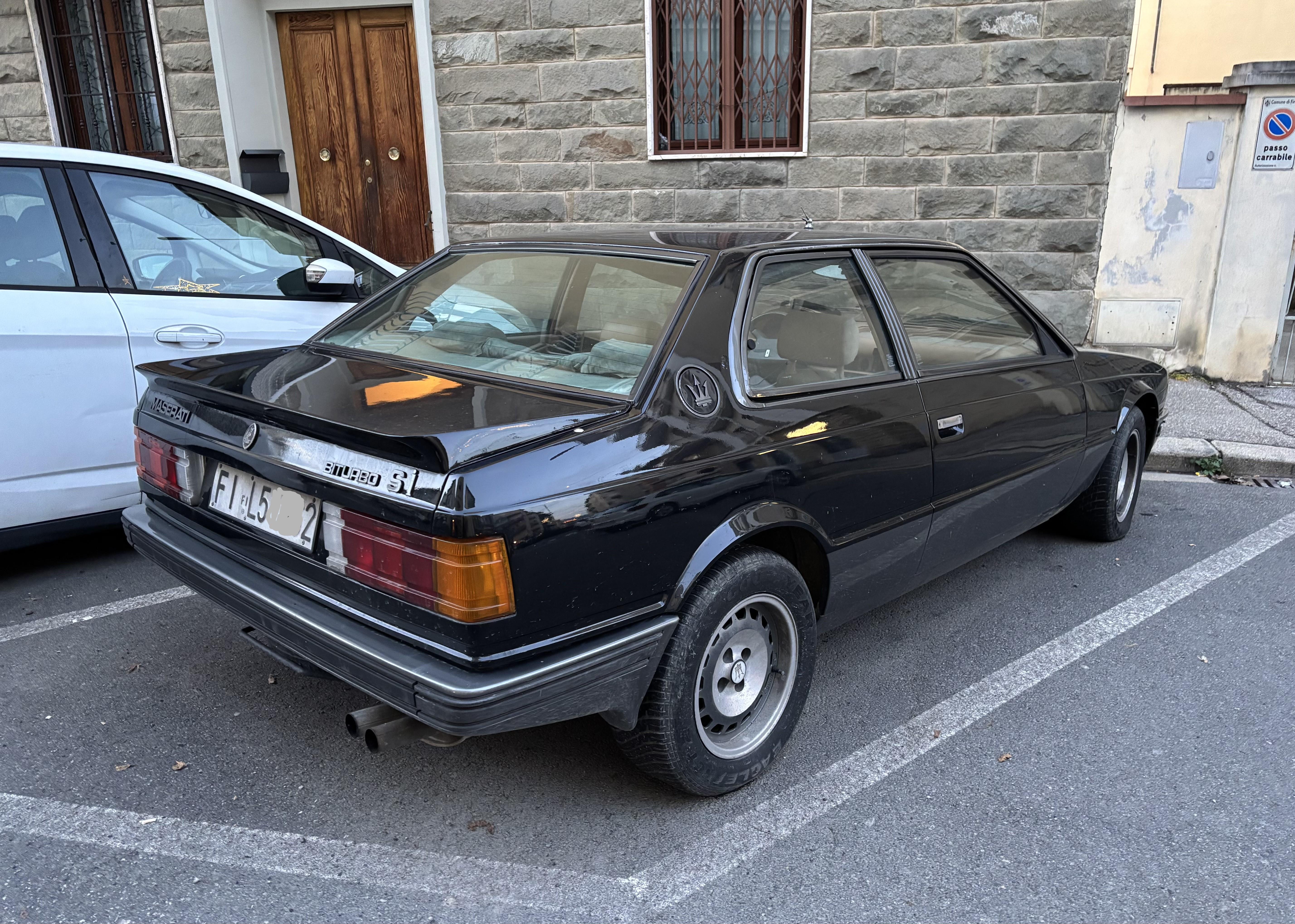 Avvistamento di un pezzo ormai raro da scorgere, soprattutto se parcheggiato normalmente per strada e lasciato lì per qualche giorno (e notte...) come una macchina qualsiasi. Maserati Biturbo Si (immatricolazione 27-6-1988, 1986 cc, 164 kW) Si tratta di una delle ultime della prima serie, appena precedente al face lifting del 1988, ma già adottava il motore con l'iniezione elettronica introdotto nel 1987, che in questa versione "S i" da 2 litri erogava una potenza massima oltre i 220 CV. Questo allestimento "S" si distingueva per vari aspetti che ne accentuavano la sportività, tra cui le prese NACA sul cofano anteriore che portavano aria all'intercooler, il quale consentiva di innalzare la potenza di una quarantina di CV rispetto alla versione standard. Poi, però, mancava lo specchio destro... 🫣