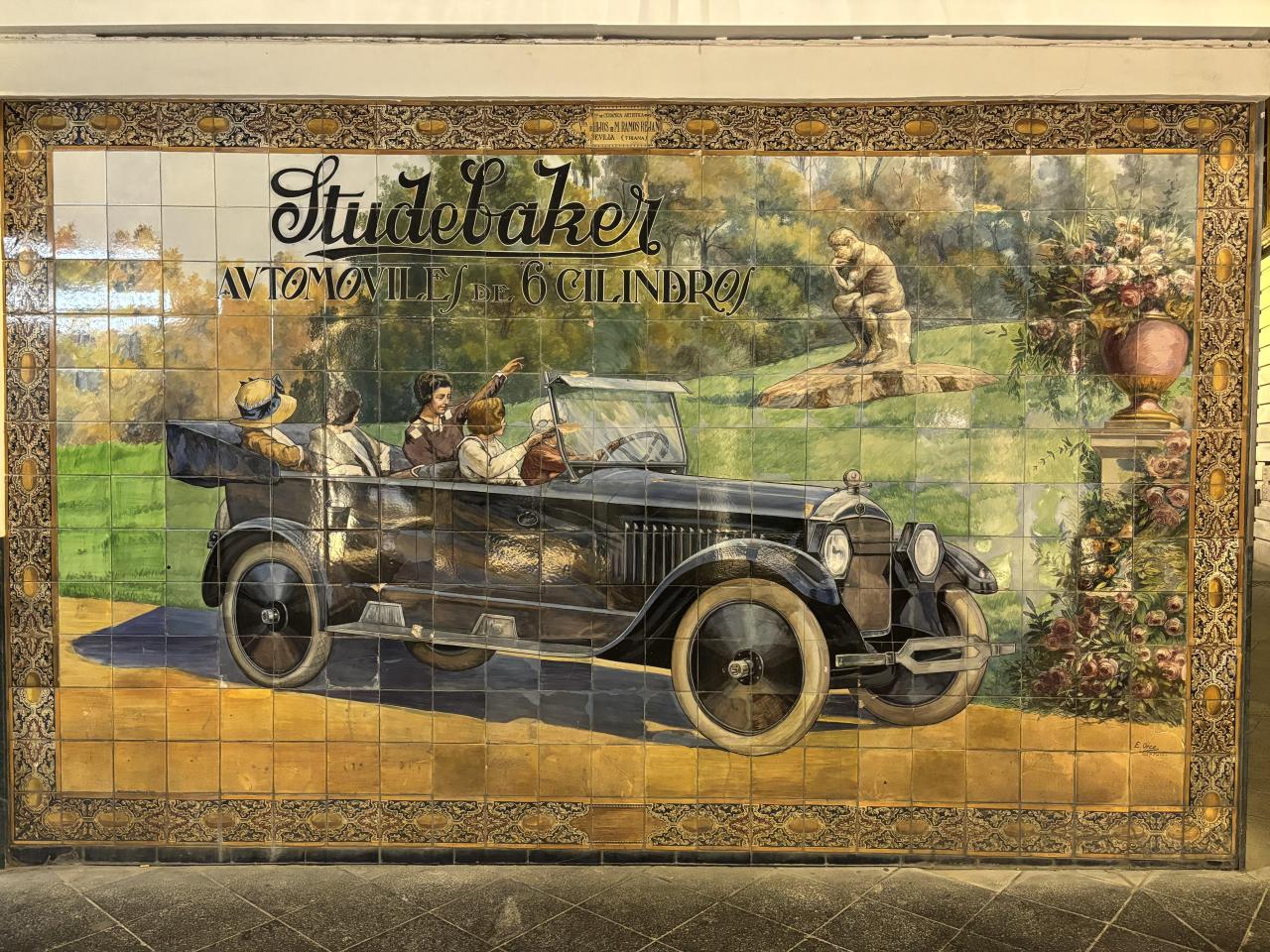 A Siviglia, in una via del centro, un bellissimo murale in ceramiche, del 1924, che si può immaginare si trovasse in corrispondenza di un garage/concessionario di Studebaker. Oggi non più esistente, com’è ovvio… Oltre alla bellezza dell’opera in sé, sono interessanti alcuni aspetti “tecnici”, come la pubblicizzata caratteristica dei 6 cilindri o le cornici dei fari esagonali… ma anche quelli più “sociali” o di marketing come la presenza di sole figure femminili a bordo dell’automobile!