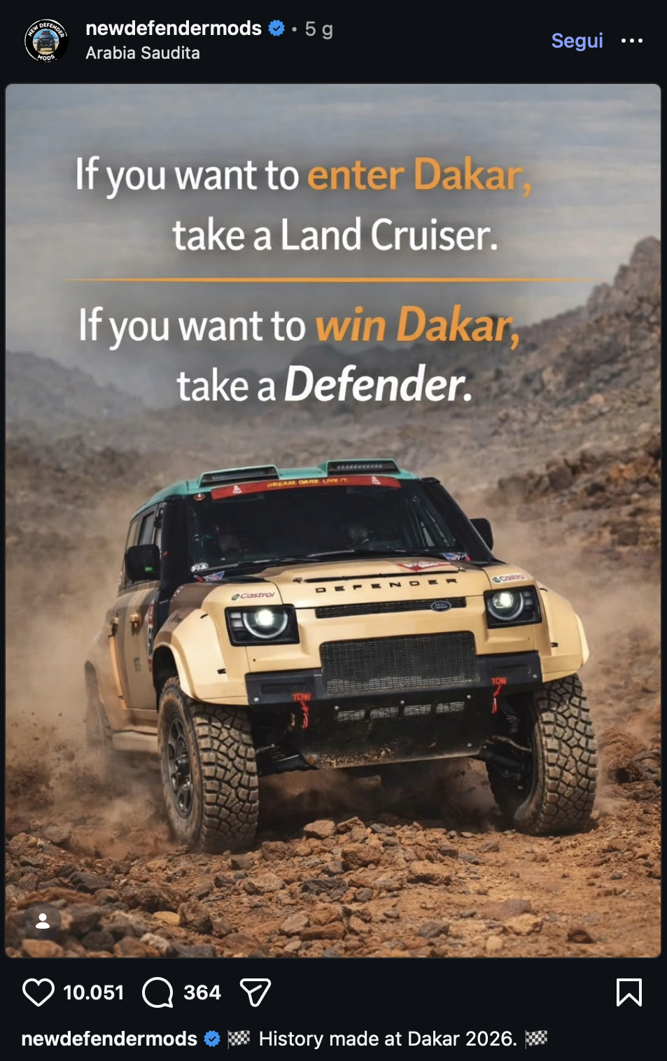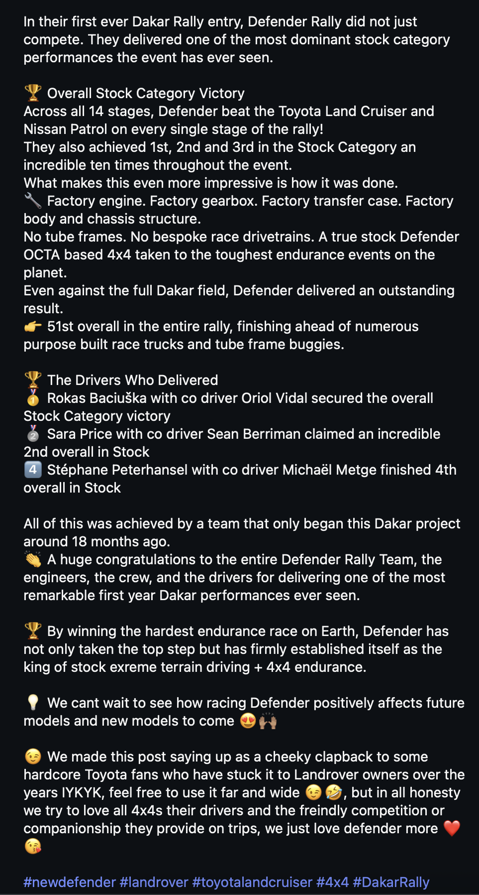 18. Dakar. Se non ho capito male, la gara è terminata oggi. Nella categoria principale ha vinto Dacia, che ha piazzato le altre due macchine in 4° e 7° posizione. Ford 2° e 3°; male le Toyota, 8, 9 e 10. Nella categoria Stock ha stravinto la Defender, che ha riempito il podio con i primi tre posti. Toyota dietro. Il resto, moto ecc. non mi interessa 😅